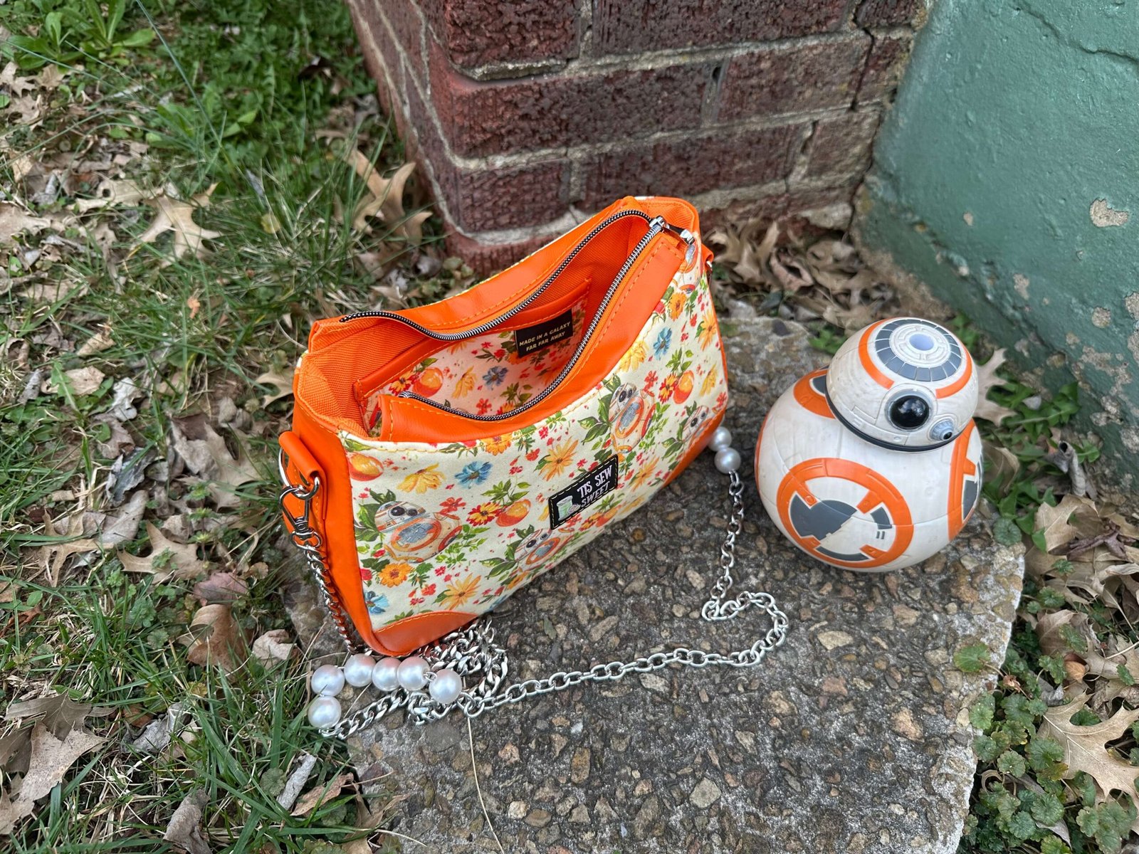 Carry a little galaxy-inspired charm wherever you go with this handmade BB BLossoms shoulder bag. Measuring 6” H x 10” W x 3.5” D, it’s the perfect size for your daily essentials while still making a bold statement. The exterior features vibrant orange accents paired with a whimsical print of BB surrounded by florals, blending geek chic with everyday style.