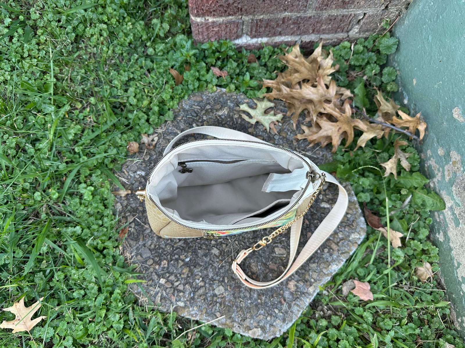 The standout reptile skin faux leather, flower zipper pulls and custom cork tag, this bag is sure to stand out when you’re out and about!